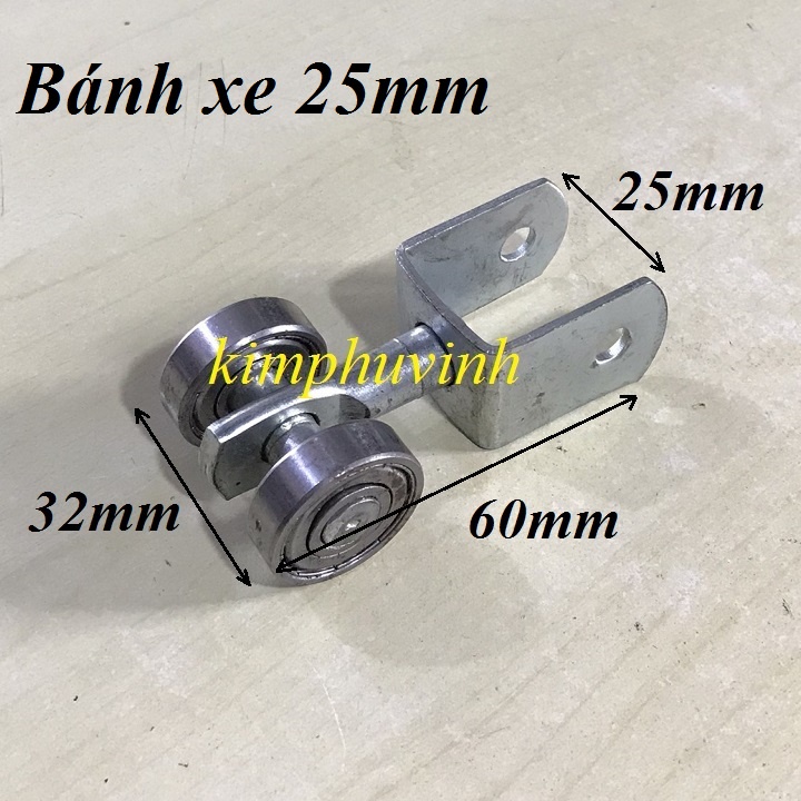 - Bánh xe treo mái xếp dùng cho máng 3x6cm. Khung chữ U của bánh xe có kích thước 25mm sử dụng cho sắt hộp.