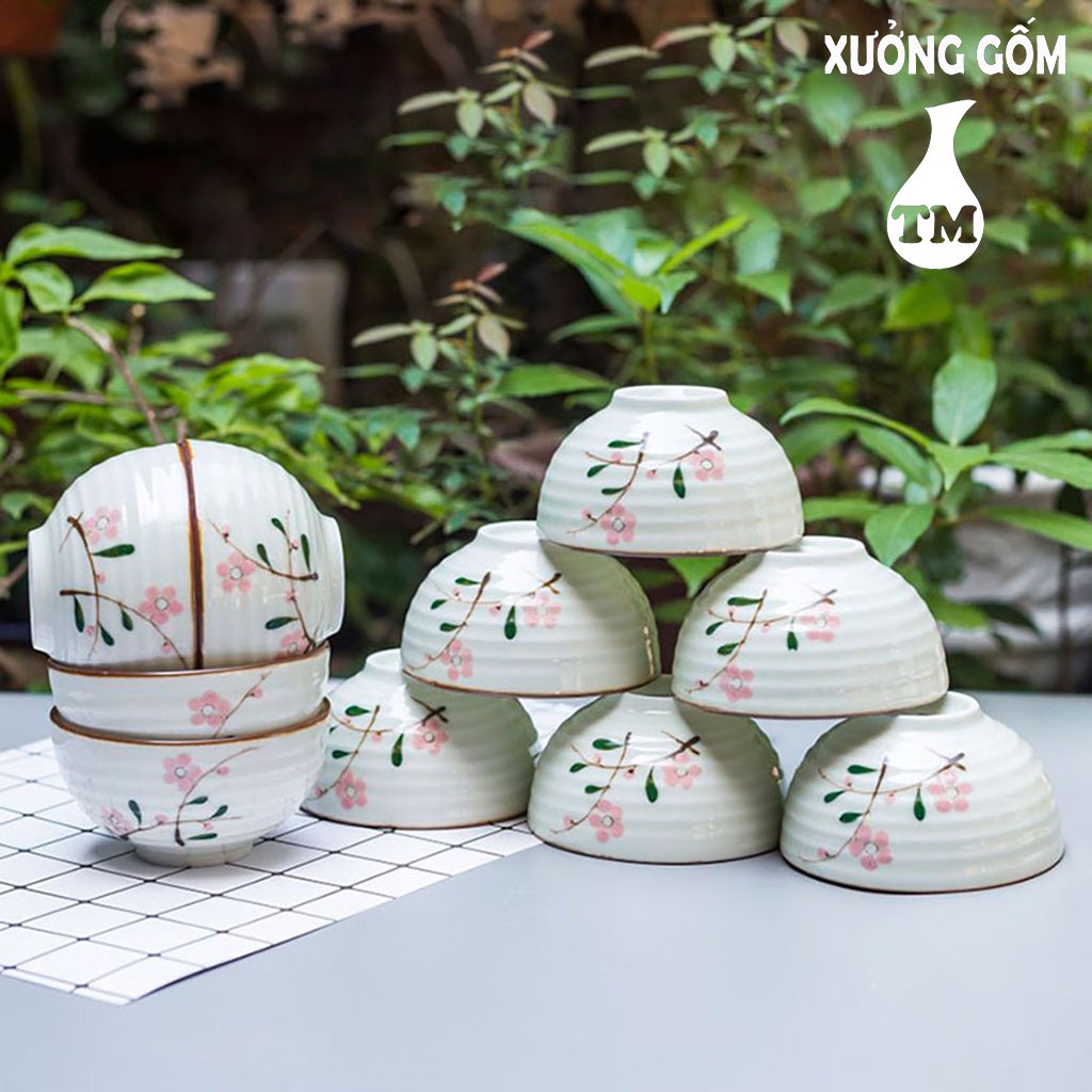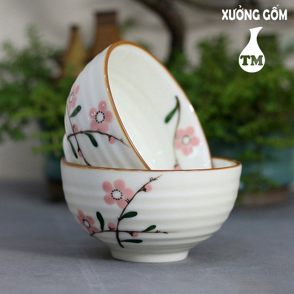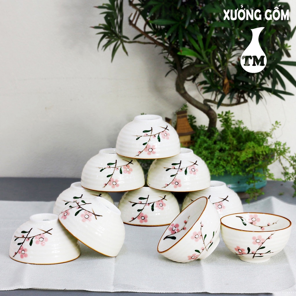01 Bát Chén Ăn Cơm Họa Tiết Vẽ Tay Hoa Đào Hồng Gốm Sứ Bát Tràng (Mua 5 Tặng 1)