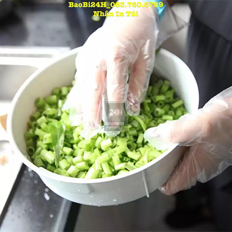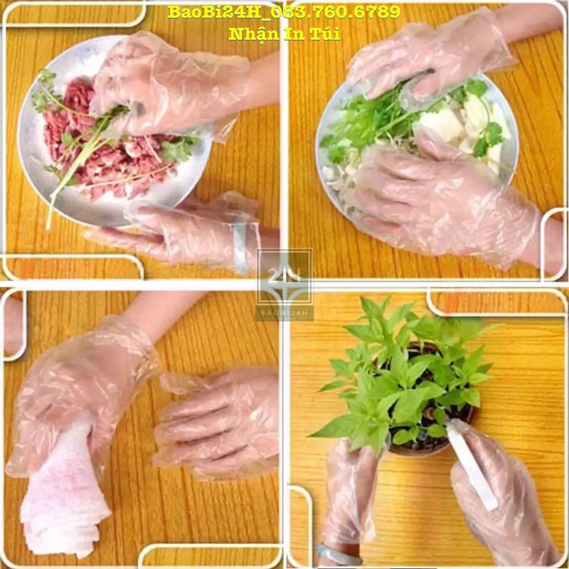 - Bao tay nylon dùng 1 lần dùng để chế biến thực phẩm, xử lý thực phẩm tươi sống, làm bánh hamburger, hoặc chế biến các món trộn, cuốn nem rán, phở cuốn...