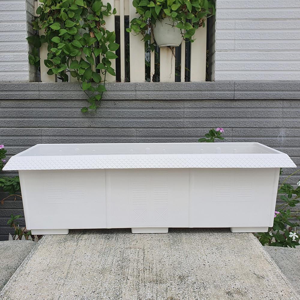 Chậu chữ nhật dài được làm bằng nhựa PP bền chắc, có tấm lưới lót giúp trữ nước và ngăn đất không rơi vãi khi tưới cây.