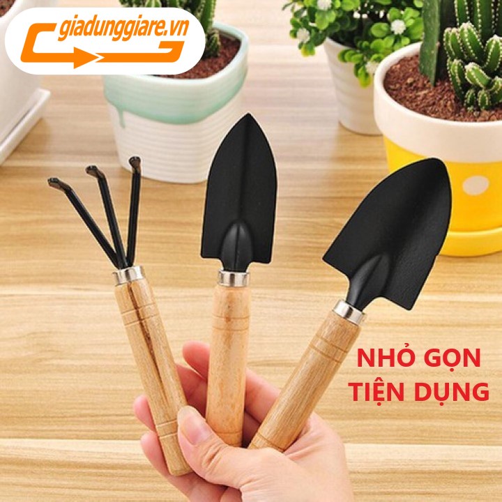 Bộ 03 Dụng cụ làm vườn mini cán gỗ (Xẻng + Bay + Cào đất) dùng đa năng trồng rau trồng hoa chăm cây cảnh tiện lợi