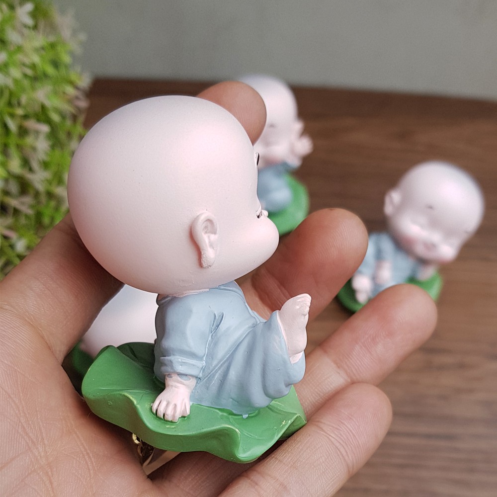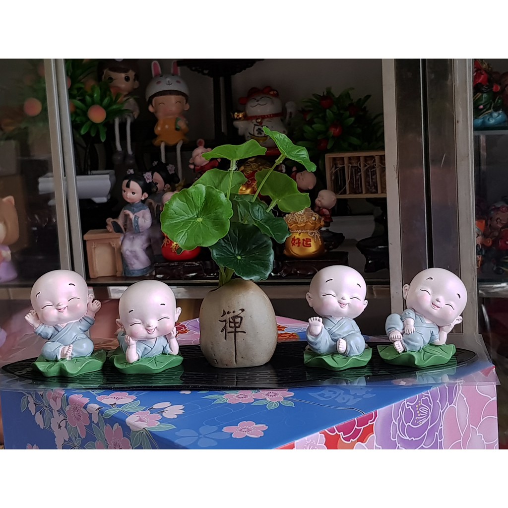 Bộ 04 chú tiểu lá sen áo lam kèm chậu lá sen trang trí