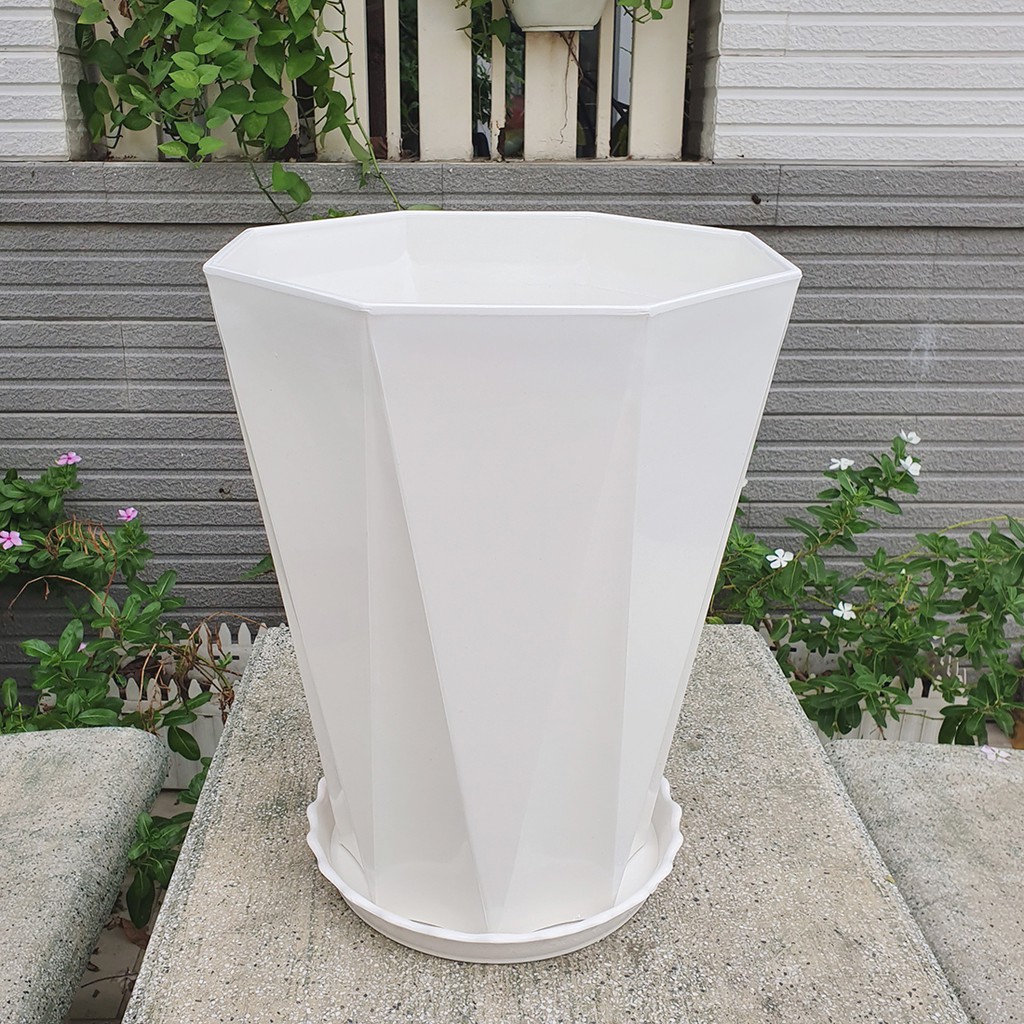Chậu nhựa cao tám cạnh màu trắng trơn rất đẹp và trang nhã; chậu lớn sử dụng cho các loại cây kiểng, rau hoa…tạo mảng xanh tươi mát, dễ chịu cho gian nhà.
