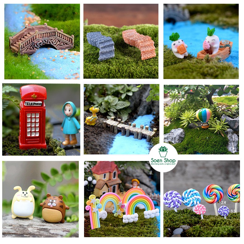 [05] Phụ kiện tiểu cảnh trang trí cây cầu, ếch, thỏ, khỉ, cầu vồng, ghế ngồi, voi, cừu, ốc sên
