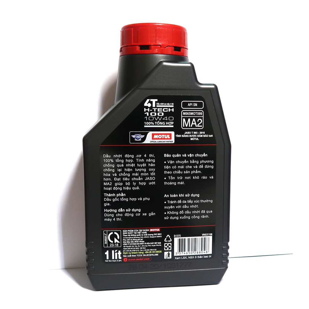 Motul H-Tech 100 4T 10W40 là sản phẩm dầu nhớt chính hãng dành cho xe máy động cơ 4 thì của tập đoàn Motul – nhà sản xuất dầu nhớt hàng đầu của Pháp. Motul H-Tech 100 4T 10W40 đã được nhiều hãng xe máy uy tín tín nhiệm và khuyên dùng trong thời gian qua, chứng tỏ khả năng vượt trội của sản phẩm dầu nhớt này đối với phương tiện đi lại tại nước ta, không chỉ bôi trơn động cơ giúp xe vận hành êm ái mà còn bảo vệ chiếc xe máy của bạn bền bỉ theo thời gian.