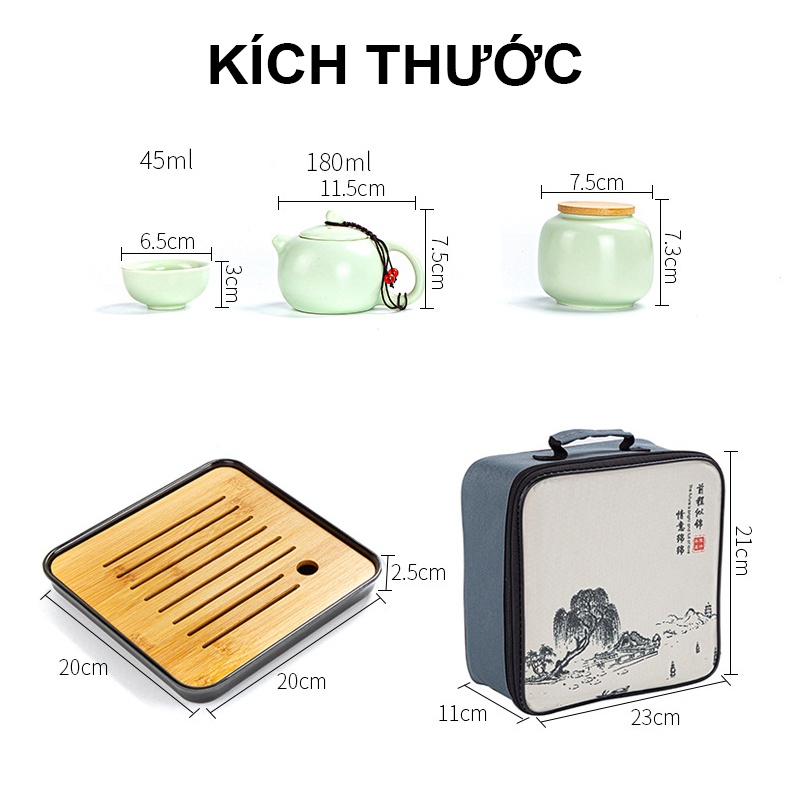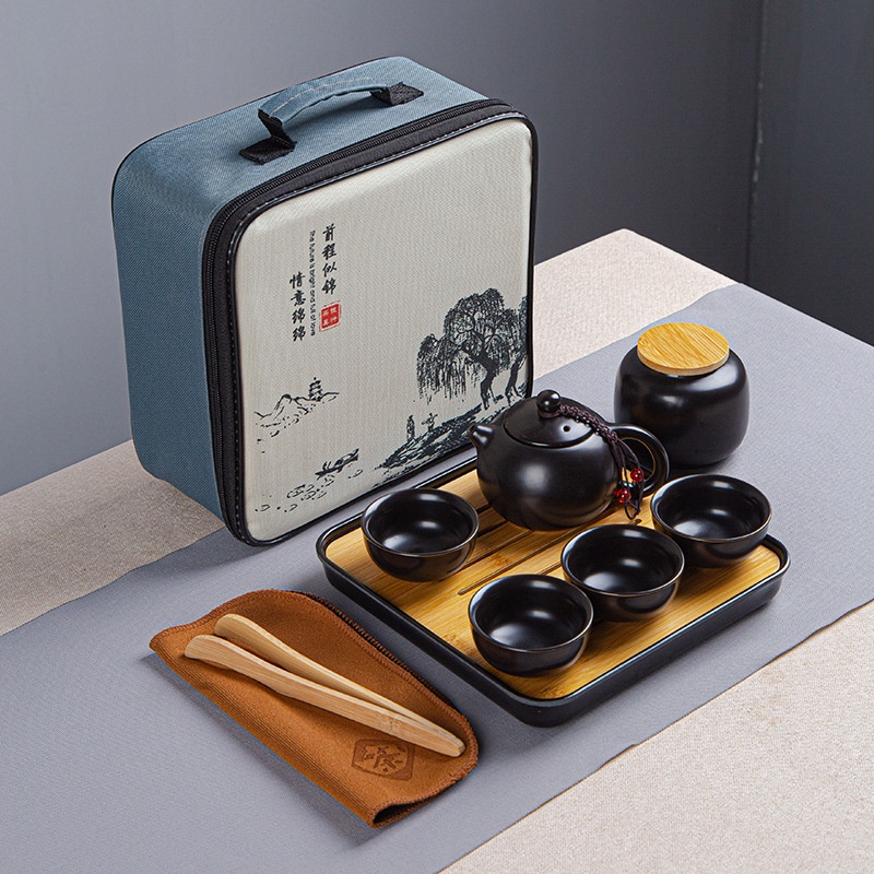 Bộ 1 bình trà, 4 cốc, 1 hộp đựng chè kèm khay, Túi Đựng bằng gốm cao sứ cao cấp đơn giản sử dụng khi đi du lịch