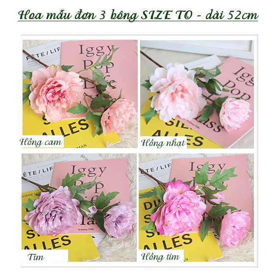 1 cành hoa Mẫu Đơn SIZE to vừa dài 52cm, gồm 2 bông 1 nụ - hoa giả giống thật - có ảnh thật, nhiều màu