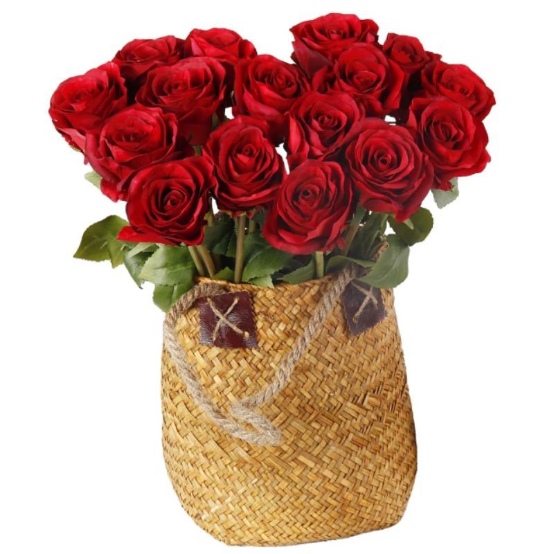 Chất liệu hoa làm vải lụa , cành hồng trứng lá và hoa làm bằng vải; cành làm chất liệu nhựaKích thước bông 5cm , cành cao 50cm