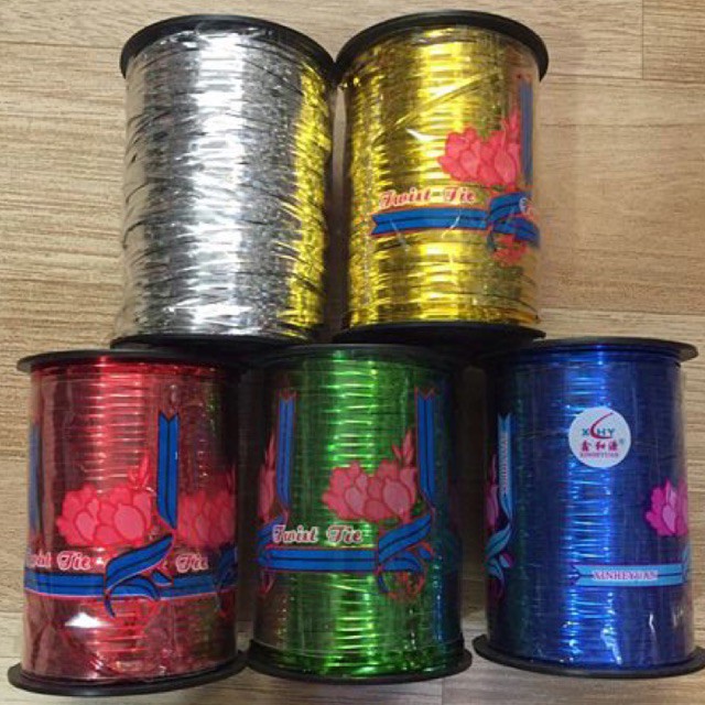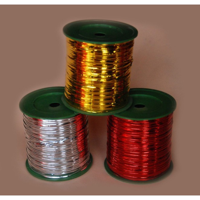 Cuộn dây kim tuyến to, trọng lượng nặng khoảng 400.Dây có nhiều màu khác nhau, Vàng ánh kim, xanh nước biển, xanh lá, đỏ và màu bạc.