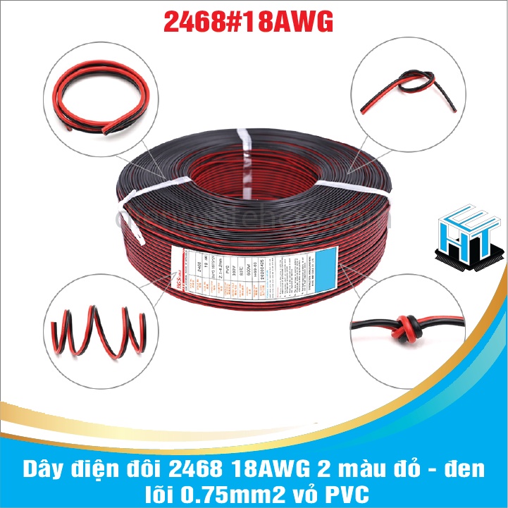 Dây điện đôi 2468 18AWG 2 màu đỏ - đen lõi 0.75mm2 vỏ PVCDây điện đôi có 2 màu đỏ + đen, với lõi đồng nguyên chất được mạ lớp niken bên ngoài để chống oxy hóa và dễ hàn vào mạch điện. Dây có lõi tiêu chuẩn 18AWG - 0.75mm2 thích hợp sử dụng làm dây cấp nguồn, dây loa,...