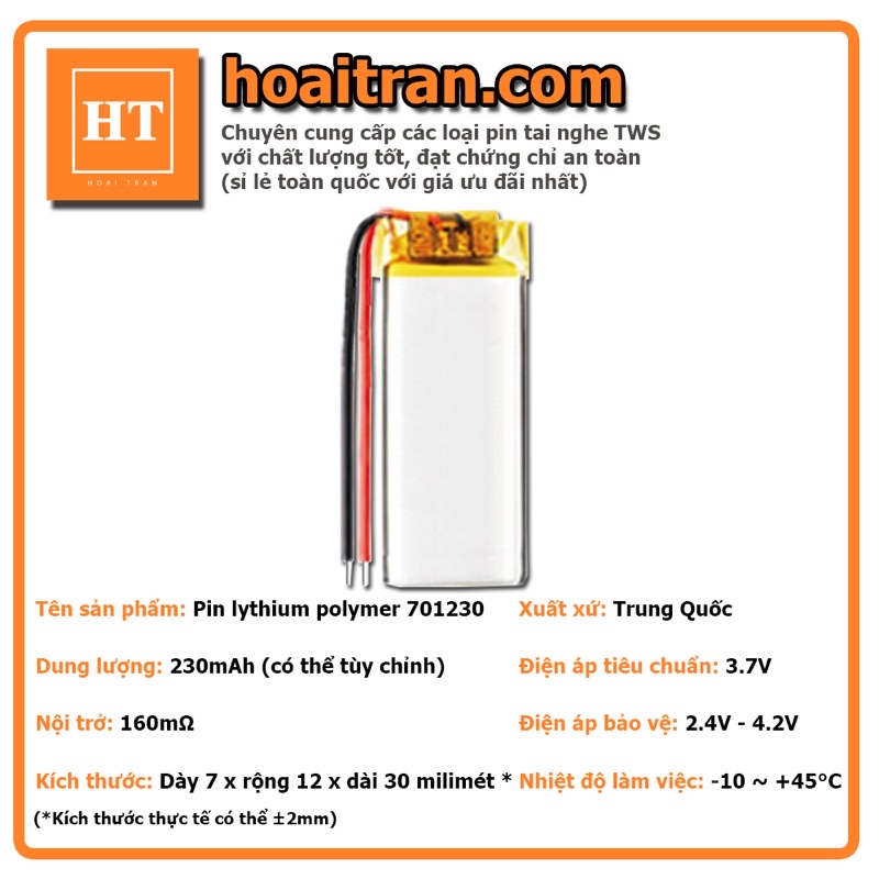 Giới thiệu [Loại 1]Pin Li-Po 3.7V 701230 230-250 mAh (Lithium Polyme) cho hộp sạc tai nghe Bluetooth