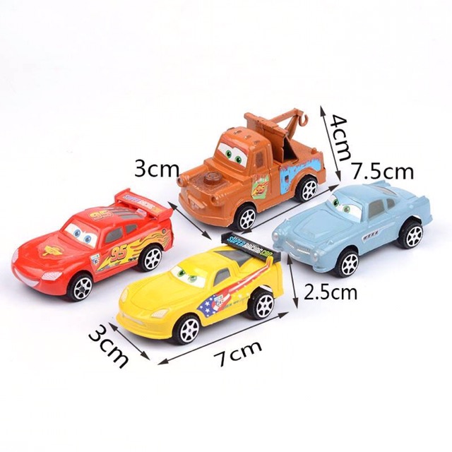 Sản phẩm gồm 1 set xe đua ô tô dùng để trang trí bánh sinh nhật các loạiGồm 4 chiếc xe