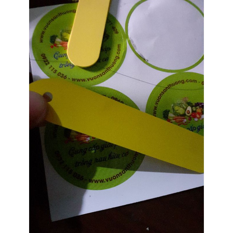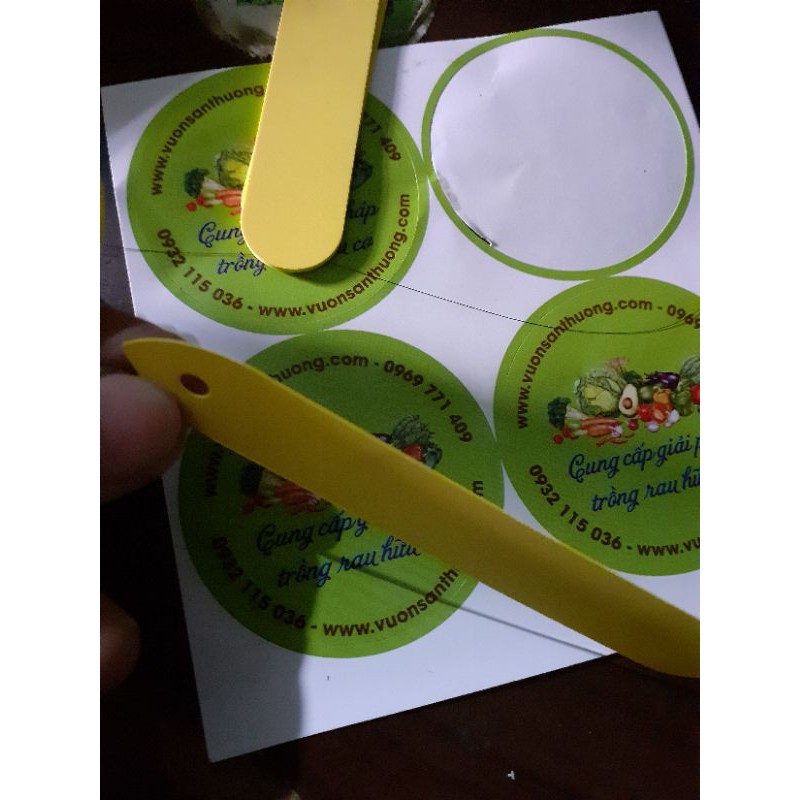 Kích thước: dài 11cm, rộng 2cm, một đầu đục lỗ dùng để móc treo, phần còn lại dùng để ghi chú tên.Tem này dùng để ghi tên, ghi giá bán, ngày trồng, màu hoa … bằng viết chì, viết lông, viết bi, … chống bị rửa trôi, phai chữ. Để chống bị nước trôi chữ, bạn nên dùng bút sơn hoặc bút dầu để ghi tên lên thẻ.
