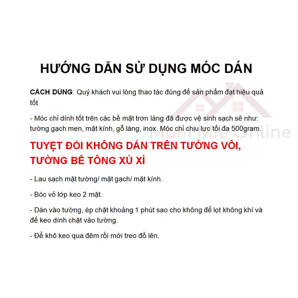 Nên vệ sinh sạch sẽ phần tường muốn dán móc trước khi dán, dán xong nên ấn chặt để móc dính tốt, sau 4 - 5 tiếng hãy sử dụng.