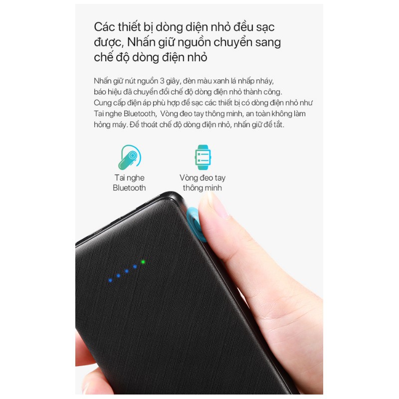 ✔ Sạc được các thiết bị dòng điện nhỏ khi nhấn nút nguồn thiết bị để chuyển sang chế độ dòng điện nhỏ. Phù hợp với các dòng Tai nghe Bluetooth, Vòng đeo tay thông minh, an toàn không làm hỏng thiết bị.