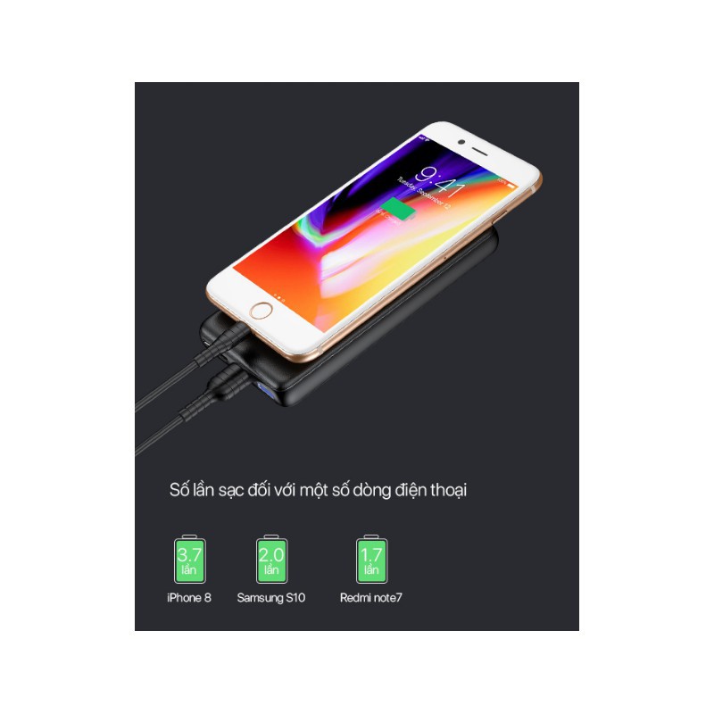 ✔ Dung lượng 10.000mAh của sạc dự phòng VPB-K10 sạc được 3.7 lần iPhone 8, 2.0 lần Samsung S10 và khoảng 1.7 lần Redmi note7.