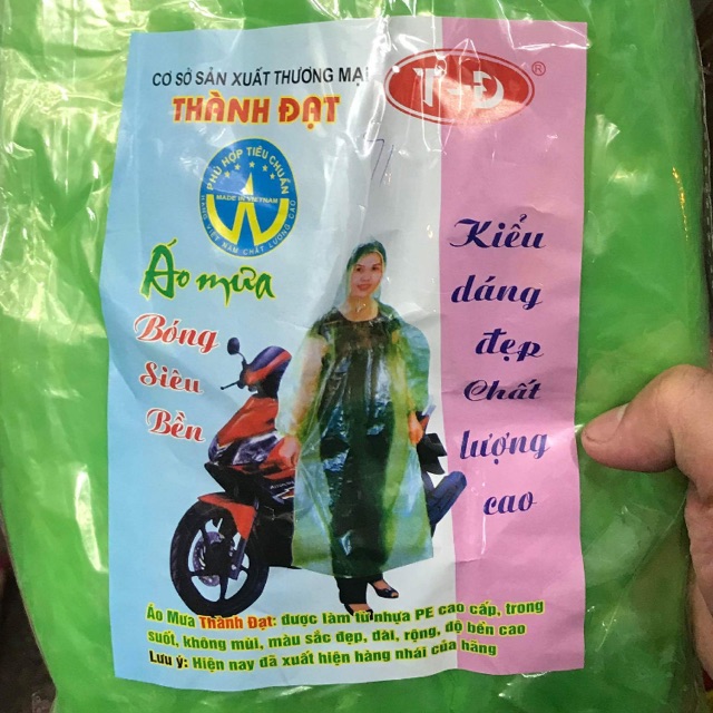Áo mưa này chất lượng thực sự tốt, nhựa dẻo dai ko như mấy loại vừa xỏ tay chui đầu vào đã rách. Dùng xong phơi lên, để khô, bảo quản tốt có thể dùng được 5-10 lần.Mô tả: Áo mưa Thành Đạt được làm từ nhựa PE , trong suốt, không mùi, máu sắc đẹp, dài, rộng, đồ bền cao.