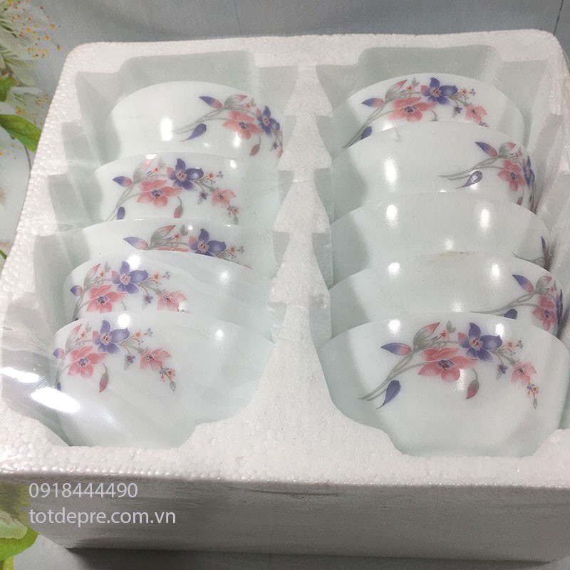 Bộ 10 bát ăn cơm sứ trắng ngọc họa tiết hoa hồng - Chén sứ ăn cơm