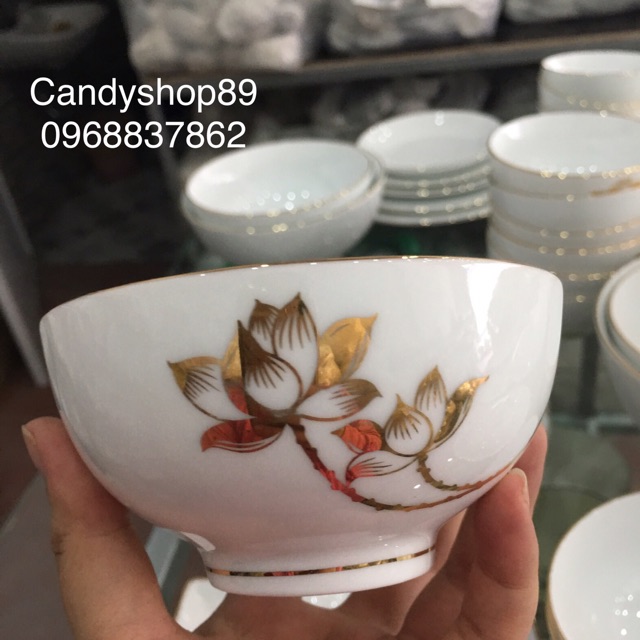 Bộ 10 bát cơm men trắng vẽ sen vàng kim - bộ đồ ăn cao cấp nát tràng