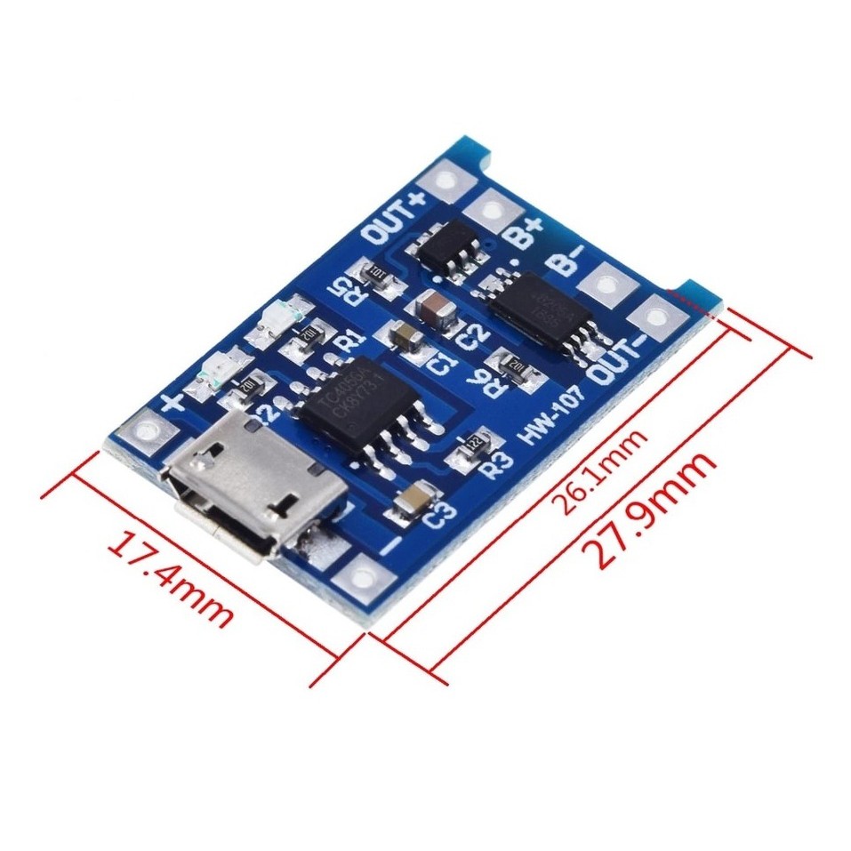 Mạch sạc pin Lithium TP4056 (1A) được sử dụng để sạc cho các loại pin Lithium có điện áp 3.7~4.2VDC (Pin Lipo, Pin 18650,...), mạch có kích thước nhỏ gọn với cổng USB kết nối tiện dụng, đèn báo đang sạc và sạc đầy hiển thị trạng thái pin, thích hợp cho các ứng dụng sử dụng pin sạc: Robot, mạch cảm biến không dây,...Thông số kỹ thuật: