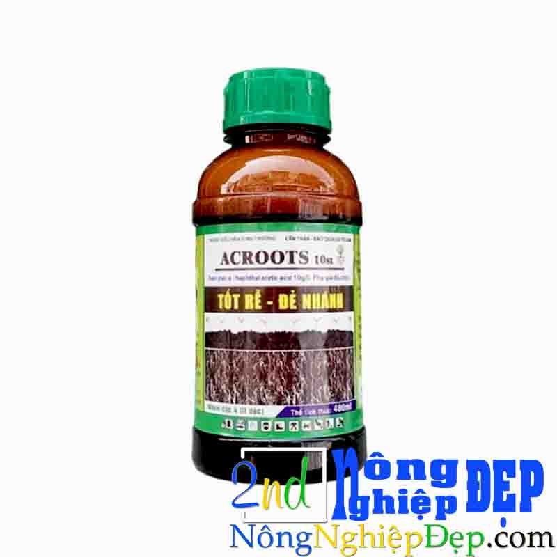 ACROOTS 10 SL chứa Auxin α - NAA có công kích thích ra rễ cực mạnh, đẻ nhánh nhiều, mập mầm, xanh cây, xanh lá... Thích hợp cho mọi giai đoạn phát triển của cây trồng, đặc biệt là khi cây trải qua giai đoạn tổn thương của bộ rễ như cây non, cây mới trồng, giai đoạn điều kiện thời tiết bất lợi (hạn hán, ngập úng, ngộ độc hữu cơ...)