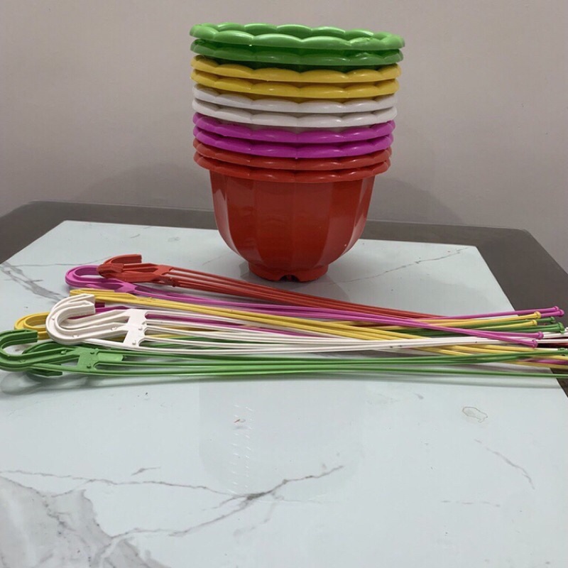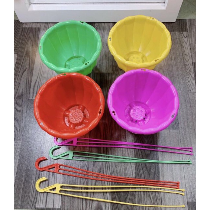 Chậu nhựa được sản xuất tại Việt Nam bằng nhựa dẻo với đủ các màu sắc cho bạn chọn,chậu có lỗ thoát nước ,có móc treo xinh xắn