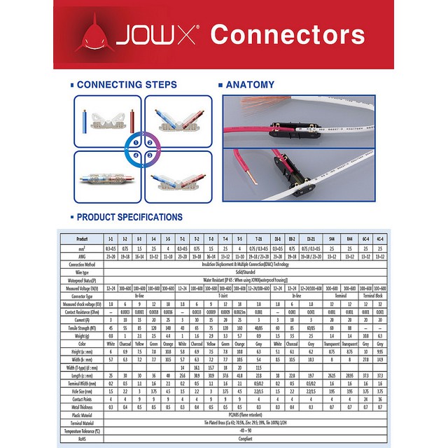 Điểm nổi bật bên trong cấu tạo của sản phẩm chính là lớp đồng nguyên chất nhình chữ V được bao bọc bởi hợp chất nhựa Polycarbonate có khả năng cách điện và chống cháy. Đấu nối bằng cách cho lớp đồng tiếp xúc trực tiếp với dây dẫn mà không cần bóc tách lớp cách điện của dây. JOWX mang lại tính tiện lợi vì không cần sử dụng băng dính cách điện hoặc bóc lớp cách điện giúp tăng thời giant hi công gấp 6 lần so với cách nối truyền thống. Sản phẩm được cấp chứng nhận theo tiêu chuẩn an toàn RoHS.