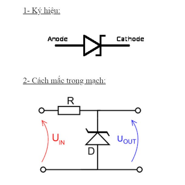 - Diode Zener được ứng dụng trong chế độ phân cực ngược, khi phân cực thuận Diode zener như diode thường nhưng khi phân cực ngược Diode zener sẽ ghim lại một mức điện áp cố định bằng chỉ số ghi trên diode.