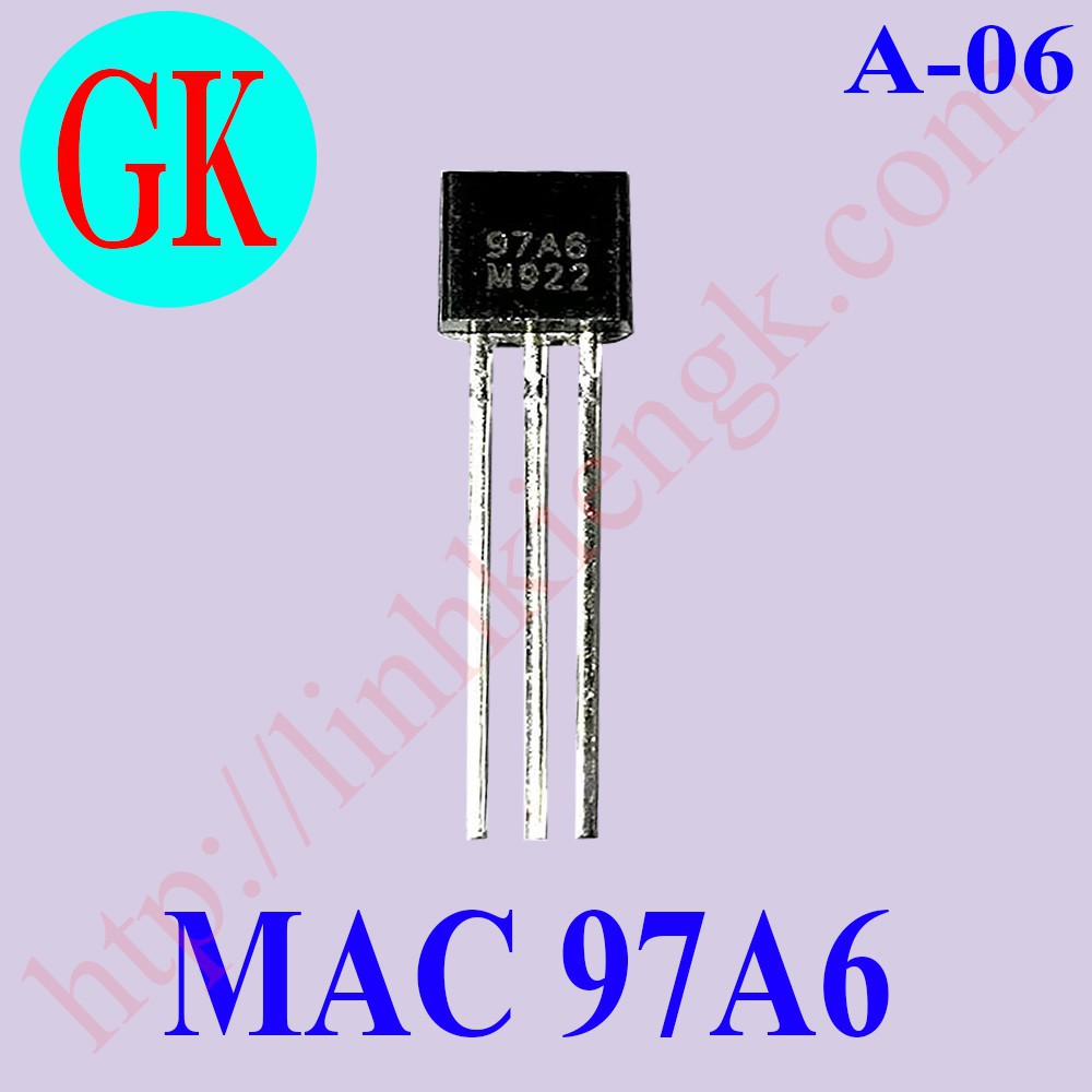 MAC97A6 - mac 97a6 - triac chân cắm to-92MAC97A6 thường dùng trong các mạch điện tử, trong đóng - ngắt các kết nối điện cơ sở dòng nhỏ.