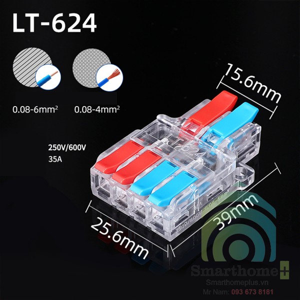 Không cần quan tâm phải nối hay quấn dây điện với nhau đúng cách thế nào. Chỉ việc xỏ các dây điện vào cút nối và gạt cần gạt nhiều màu giữ chặt dây là xong, cút nối điện LT được thiết kế 2 có thể chia 2 dây vào với 4 hoặc 6 dây ra.