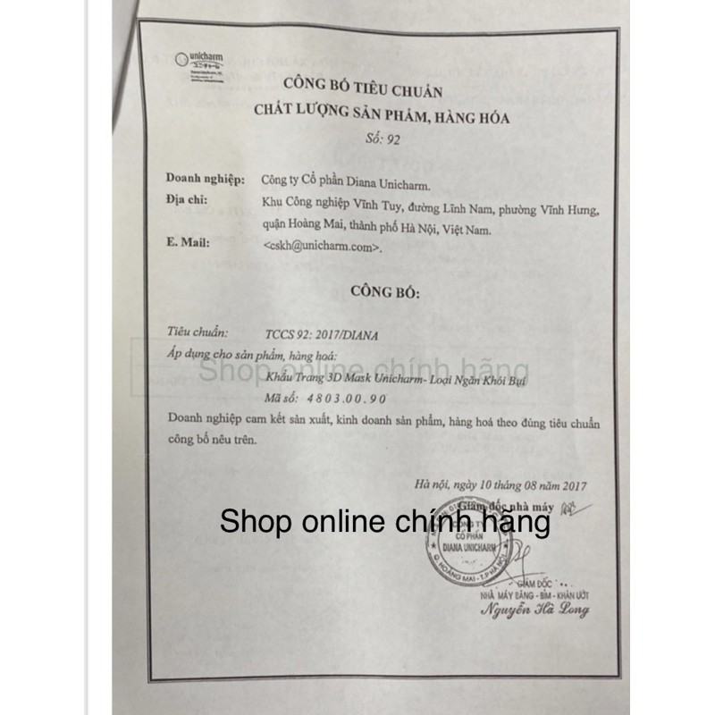 Công ty Cổ phần Diana Unicharm là một Công ty hàng đầu trong ngành hàng sản xuất các sản phẩm chăm sóc phụ nữ và trẻ em tại Việt Nam (chuyên sản xuất các mặt hàng từ giấy và bột giấy như băng vệ sinh, tã giấy cho trẻ em, khăn giấy ăn với các thương hiệu nổi tiếng như Diana, Bobby, Caryn, Libera…). Sử dụng thế mạnh là thành viên của tập đoàn hàng đầu thế giới Unicharm Nhật Bản, công ty Diana Unicharm luôn đi đầu áp dụng những công nghệ mới nhất trong lĩnh vực sản xuất các sản phẩm chăm sóc vệ sinh cá nhân để sáng tạo ra những sản phẩm có chất lượng cao nhất và phù hợp nhất, góp phần nâng cao chất lượng cuộc sống của người tiêu dùng Việt Nam. Khẩu trang Unicharm 3D Mask là sản phẩm nổi bật trong việc chăm sóc sức khỏe tối ưu cho người dùng.