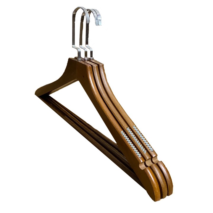 Mổ tả: móc gỗ nâu vai đệm có thanh ngang được thiế kế sang trong với màu gỗ nâu, đầu móc dẹp được xi mạ sáng bóng hạn chế gỉ sét khi sử dụng thời gian dài. thích hợp cho việc treo quần áo người lớn trong gia đình và các shop, xưởng thiết kế quần áo.