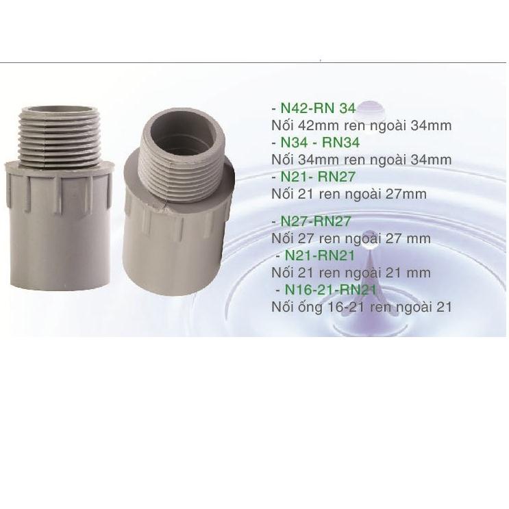 Nối 21 mm ren ngoài 21mm PVC dùng trong lắp đặt hệ thống tưới khi muốn sử dụng các béc phun hay thiết bị tưới có răng trong 21.Một đầu là răng ngoài 21 tiêu chuẩn, đầu còn lại là nối ra ống 21 mm tiêu chuẩn.