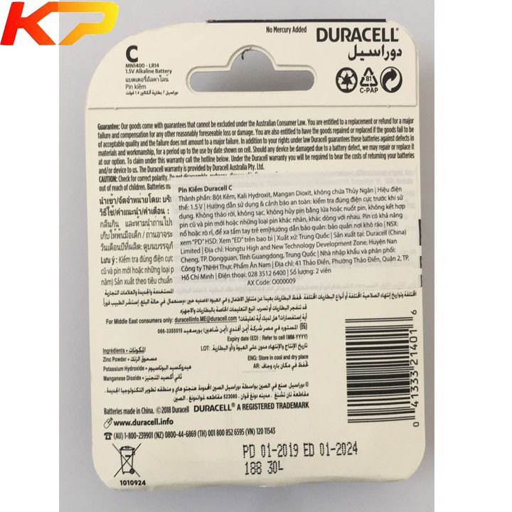 Loại SP : Pin kiềm alkaline 1.5v cỡ C không sạc- MÃ SP : MN1400BP2, LR14