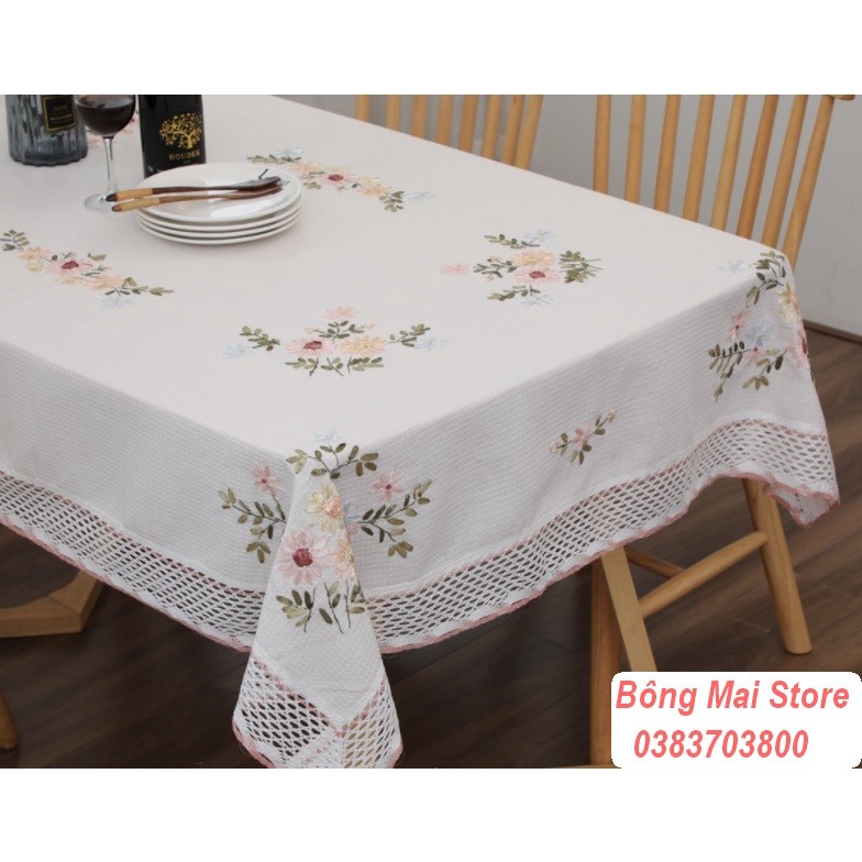 [100*150cm] Khăn trải bàn vải cotton viền ren hoạ tiết thêu nổi phong cách vintage sang trọng [T051]
