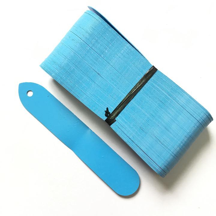 Làm bằng nhựa màu trắng, dài 11cm, rộng 2cm, một đầu đục lỗ dùng để móc treo, phần còn lại dùng để ghi chú tên.