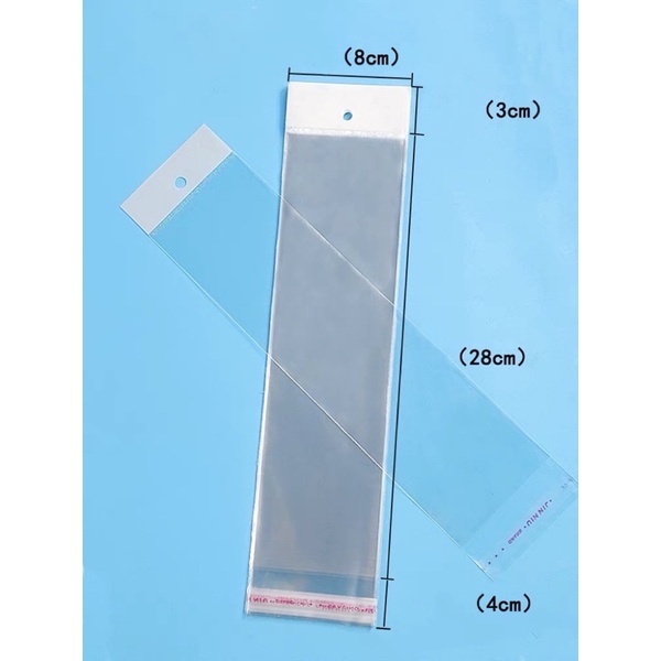 Giới thiệu 100 cái túi kiếng trong 8x28 (+3+4) Opp nilon dán miệng màng ngọc có lỗ treo rộng 8cm dài 28cm