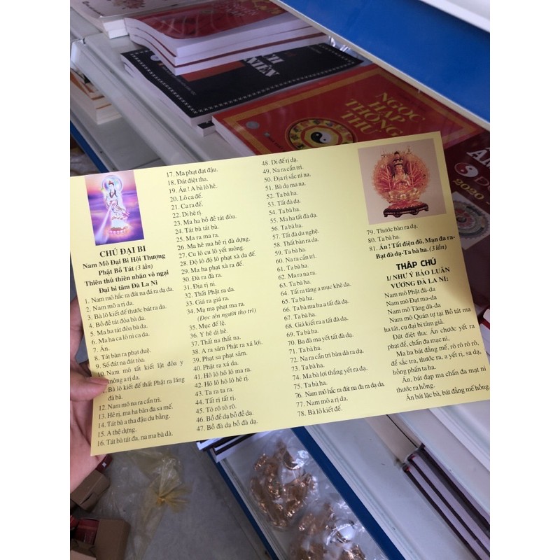 sản phẩm gồm 100 tờ chú đại bi vào 10 kinh địa tạng để quý thầy hoặc quý phật tử đi tặng, gieo duyênKinh địa tạng, kinh diệu pháp liên hoa, kinh vu lan, kinh vô lượng thọ.... quý Phật tử cần loại nào kính mời ib shop để được tư vấn miễn phí ạ.