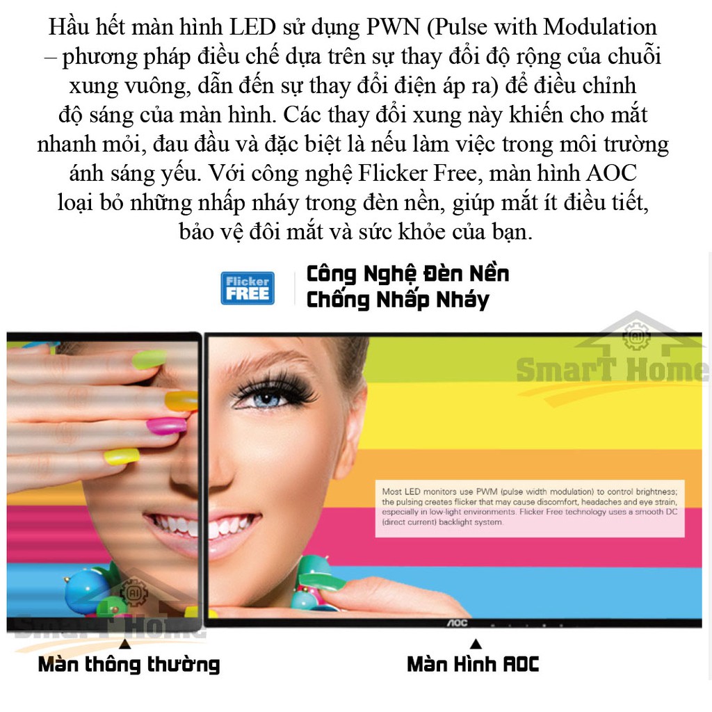 💠Hầu hết màn hình LED sử dụng PWN (Pulse with Modulation – phương pháp điều chế dựa trên sự thay đổi độ rộng của chuỗi xung vuông, dẫn đến sự thay đổi điện áp ra) để điều chỉnh độ sáng của màn hình. Các thay đổi xung này khiến cho mắt nhanh mỏi, đau đầu và đặc biệt là nếu làm việc trong môi trường ánh sáng yếu. Với công nghệ Flicker Free, màn hình AOC loại bỏ những nhấp nháy trong đèn nền, giúp mắt ít điều tiết, bảo vệ đôi mắt và sức khỏe của bạn.