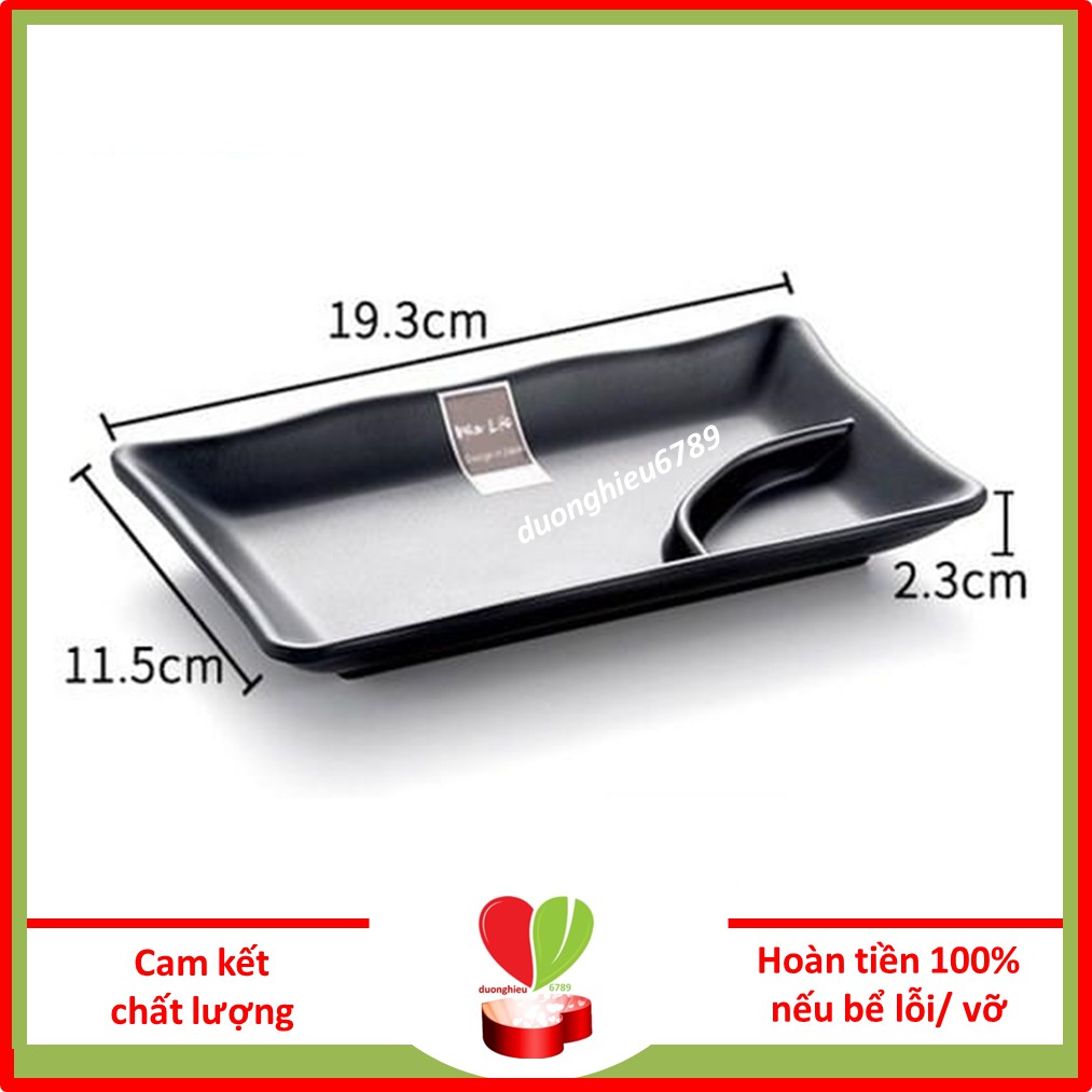 [100%Melamine] Dĩa Nhựa Phíp Đen, Đĩa melamine Hình Chữ Nhật 2 Kiểu Tiện Lợi - Duonghieu6789Đĩa nhựa đen hình chữ nhật loại không có và có ngăn nhỏ để nước sốt cho món ăn vặt đủ size