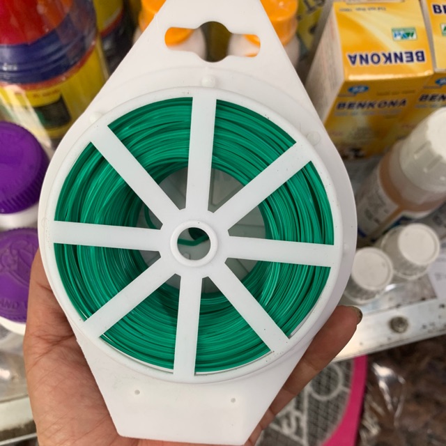 Dây kẽm bọc nhựa cố định cành hoa, cây cảnh, dây điện, ... Quy cách: cuộn 100 mét Màu sắc: màu xanh thẫm Dạng dây; tròn Công dụng: buộc cố định cành hoa cây cảnh, cố định dây điện trong gia đình ... Ưu điểm: Dây kẽm được bọc nhựa nên Không bị hoen gỉ do thời tiết Dây kẽm mềm nên Không làm ảnh hưởng đến cành non, cây non Có dụng cụ cắt kèm theo, nên rất tiện lợi khi sử dụngGiá PCD