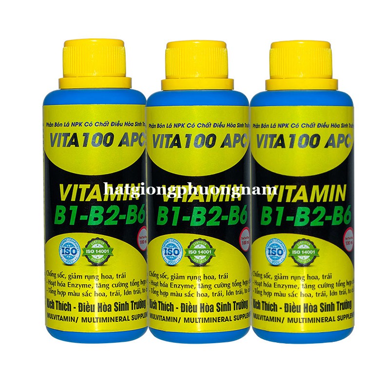 + Phân bón lá Vita100 APC đặc biệt có chứa Vitamin B1, Vitamin B2, Vitamin B6, cùng các hợp chất chiết xuất từ thiên nhiên có chứa các chất kích thích, điều hòa sinh trưởng có nguồn gốc hữu cơ thực vật, cùng với các enzym, Phytohormones, các chất đa, trung, vi lượng thiết yếu.