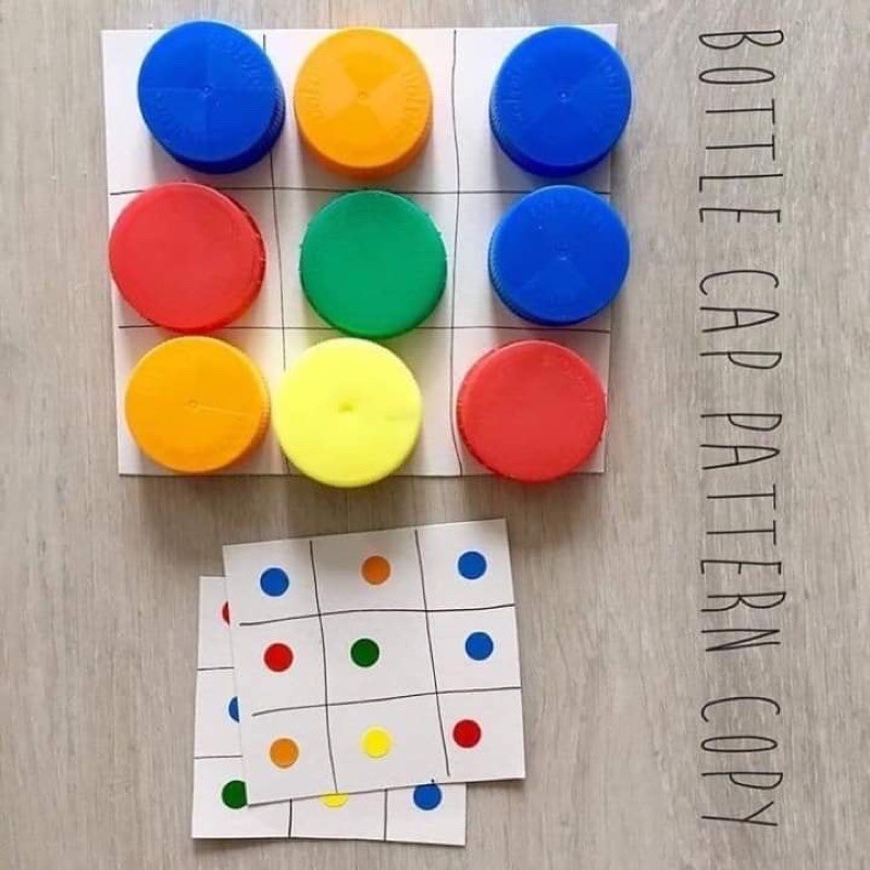 Nắp chai màu đủ màu sử dụng làm đồ chơi mầm non. Thiết kế đồ dùng dạy học cho trẻ.