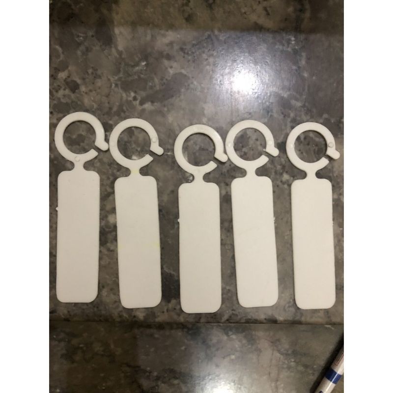 Làm bằng nhựa, có móc cong dùng để móc treo, phần còn lại dùng để ghi chú tên.