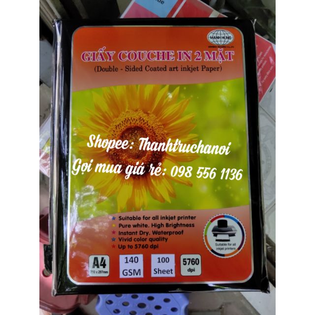 Đặc điểm:- Giấy Couche in 2 mặt Mạnh Hưng được sử dụng bằng nguyên liệu giấy cao cấp để sản xuất, đặc biệt là lớp bột phủ và giấy bìa tạo nên chất lượng ảnh in cao, không bay màu, màu sắc rõ nét không nhòe mực, khô nhanh, chống nước tốt, giữ màu bền.