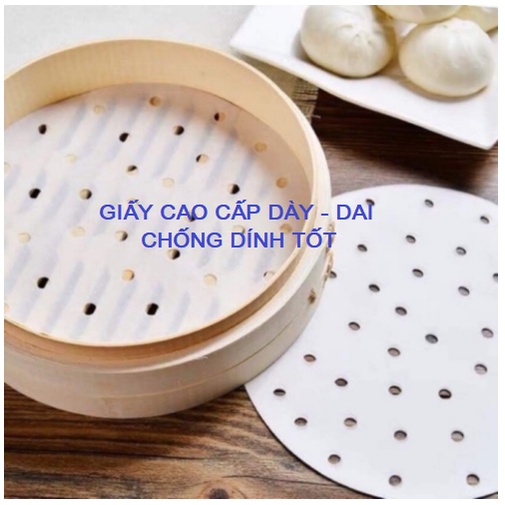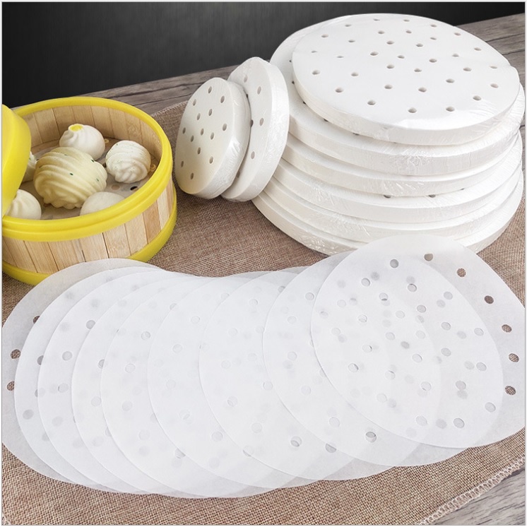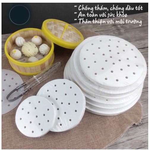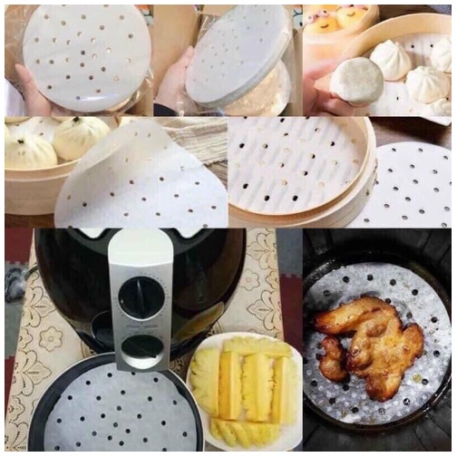 Nhà cửa & Đời sống > Dụng cụ nhà bếp > Giấy bạc || 100 tờ giấy nến tròn đục lỗ tráng silicon chống dính lót xửng hấp bánh, nồi chiên không dầu, giấy thấm dầu siliconCòn hàng