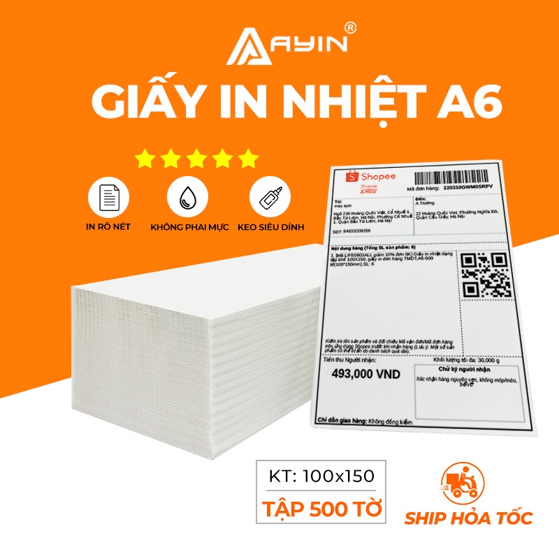 - Khổ giấy chuẩn: Khổ A6 100*150mm, tương thích với các sàn TMĐT, các đơn vị vận chuyển, các phần mềm quản lý bán hàng.