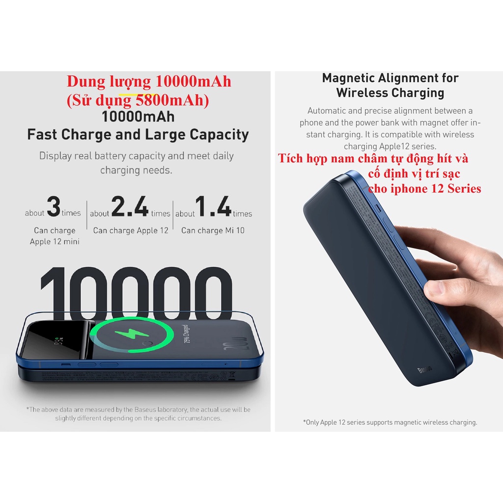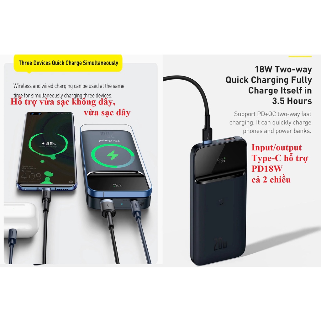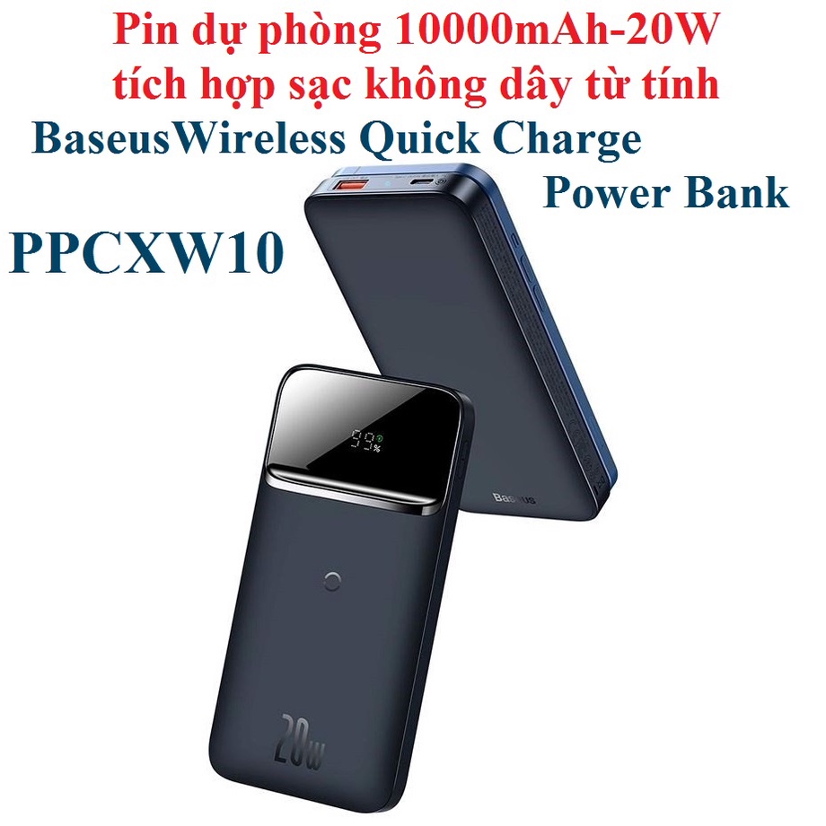 Pin dự phòng 10000mAh 20W tích hợp sạc không dây Baseus Magnetic Wireless Quick Charging Power Bank , model: PPCXW10-Dung lượng 10000mmAh