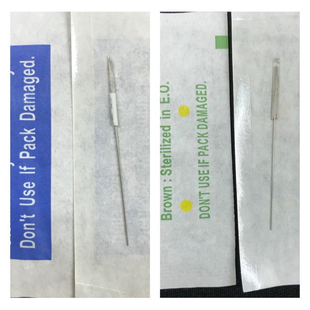 - Kim có 2 cỡ : xanh lá (0,35x50) và xanh biển (0,4x50). Bao gồm #kimtròn và #kimdẹt.