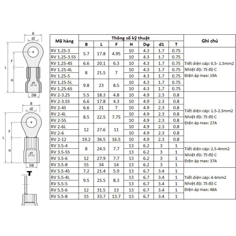. Mã: RV 1.25-8 dùng cho dây từ 0.5 đến 1.5 bắt cho ốc 8